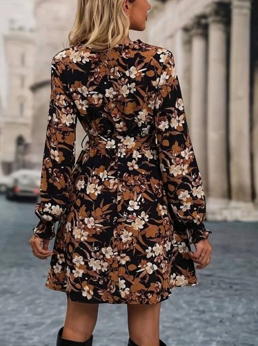 • Kadın uzun kollu kruvaze yaka çiçek desenli dalgıç elbise