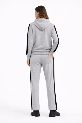 • KADIN Yandan Şeritli Eşofman Takım Kapüşonlu Sweatshirt Boru Paça Alt Oversize 3 iplik Pamuklu Gri
