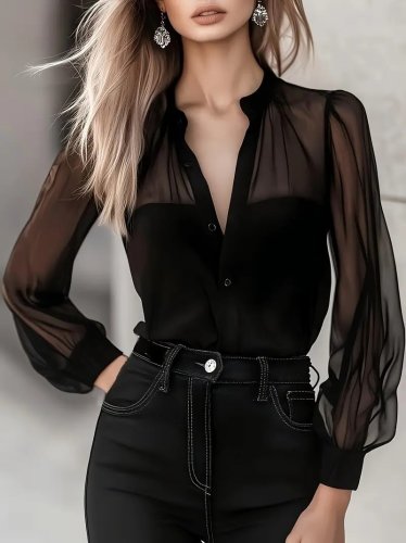 • Kadın uzun kollu hakim yakalı önden düğmeli tül detaylı trikoton gömlek