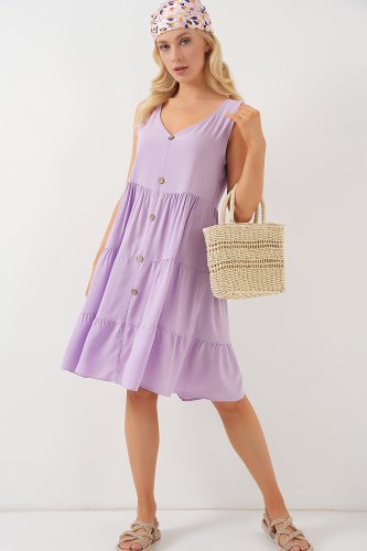 Sıfır Kol Düğmeli Kısa Elbise 2571 Lila